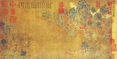 这幅画便是隋代展子虔的《游春图》,此画据说是展子虔存世的唯一真迹,画上有宋徽宗赵佶题写的“展子虔游春图”字样。画家用细而有力的线条勾画出物象的轮廓,人物虽小如豆粒,却一丝不苟,形态毕现;山石树木也用线条勾出,可以清晰地看到行笔的轻重、粗细、顿挫、转折。从画上题记钤印可知,《游春图》曾分别被宫廷、皇族和权贵收藏,在《钤山堂书画记》中也有著录,是一幅流传有序的中国早期山水画珍品。