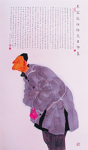 《大家张伯驹先生印象》,黄永玉所作,其上长题有云:某日于西郊莫斯科餐厅,忽见伯驹先生蹒跚而来。