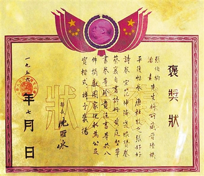 1950年代中期,张伯驹与夫人潘素一道,将陆机《平复帖》、范仲淹《道服赞》、蔡襄自书诗册等八件绝世珍品无偿捐给故宫博物院。此前,他们还把《游春图》等无价之宝献给了国家。张氏夫妇用一生中最珍贵的藏品,换回了文化部长沈雁冰亲笔签发的一纸奖状: