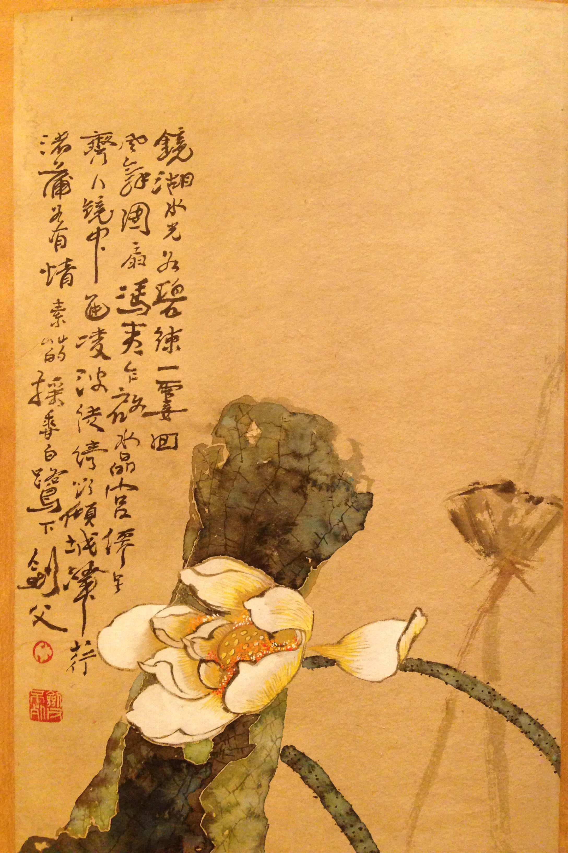 此画描绘的湖中残荷,形象生动,画作充分展现了作者的撞水法画风,画面右上角题字对画作场景进行了描述,落款剑父,有印章。此画体现了传统国画中的创新是难得一见的书画收藏佳品。