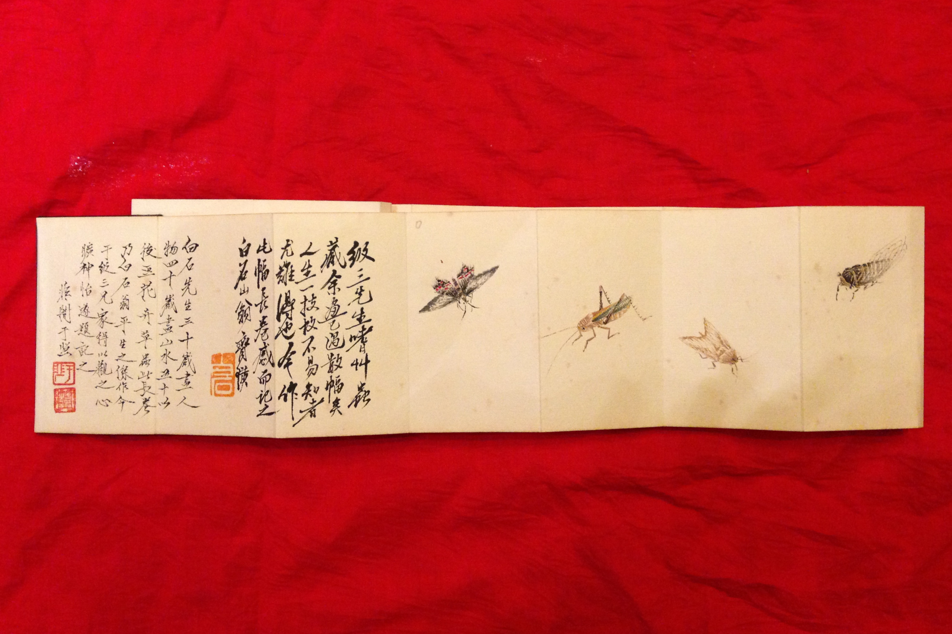 齐白石(1864─1957)、原名纯芝、字渭青、号兰亭、后改名璜、字濒生、号白石、白石山翁、湖南湘潭人、近现代中国绘画大师、世界文化名人、擅画花鸟、虫鱼、山水、人物、衰年变法、笔墨雄浑滋润,色彩浓艳明快,造型简练生动,所作鱼虾虫蟹,天趣横生。其书工篆隶,取法秦汉碑版,行书饶古拙之趣,篆刻自成一家,亦能诗文。和张大千并称“南张北齐”。此画色彩浓艳明快,造型简练生动,整幅画共绘蜻蜓、蚱蜢、蝴蝶、蝉等形態各異﹐色彩不同的十五只昆虫,活灵活现、似真物在眼前;画册上留题字和多枚名贵印章。是难得先生花鸟草虫图册佳作,具有很高的收藏价值。