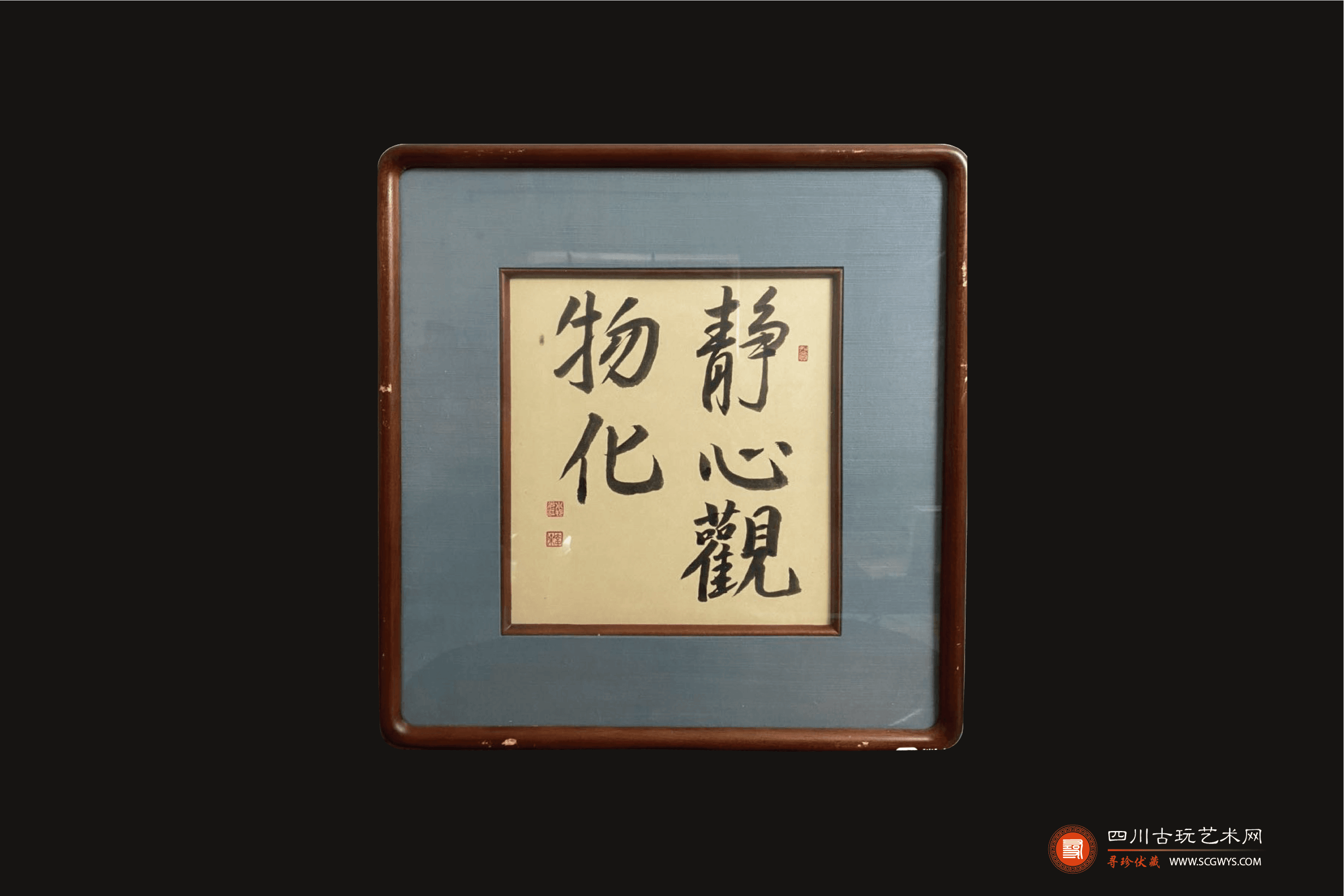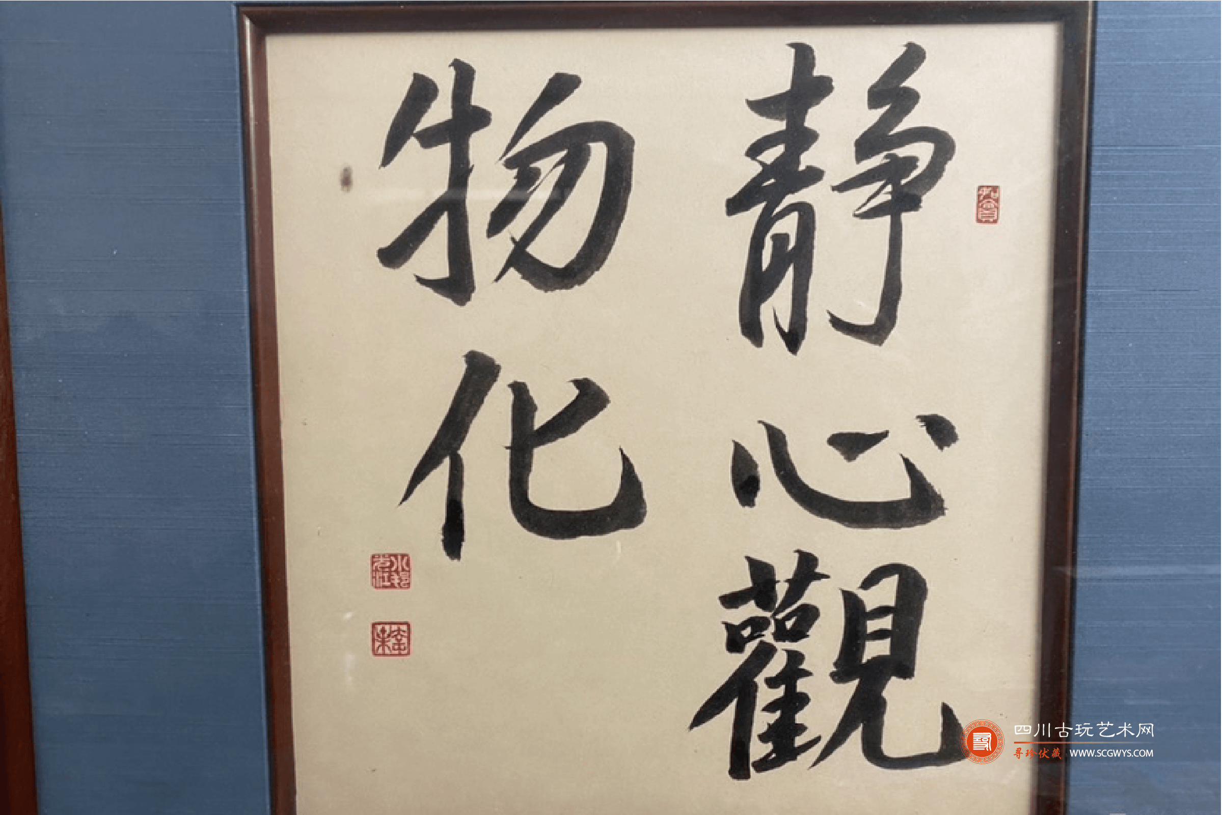 藏品描述:红木框装裱,纸本,正文五个行书大字“静心观物化“,右侧方形篆刻闲章一枚, 左侧落款处姓名章两枚。框架有轻微磨损痕迹。