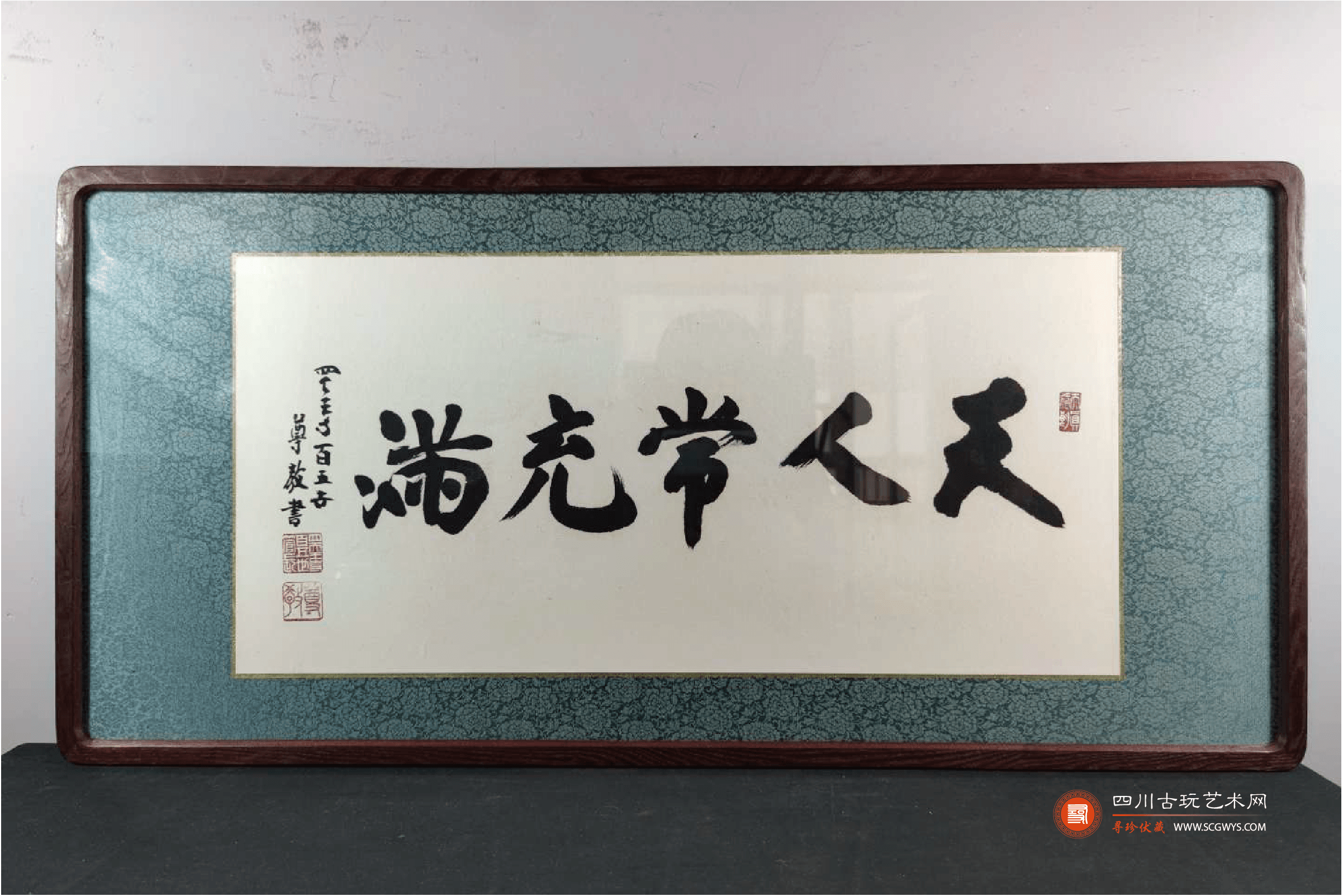 藏品描述:纸本凌裱,木框,正文五个行书大字“天人常充满“,落款日期及作者姓名,右侧方形篆刻引首章一枚, 左侧落款处姓名章两枚,一 阴一阳。
