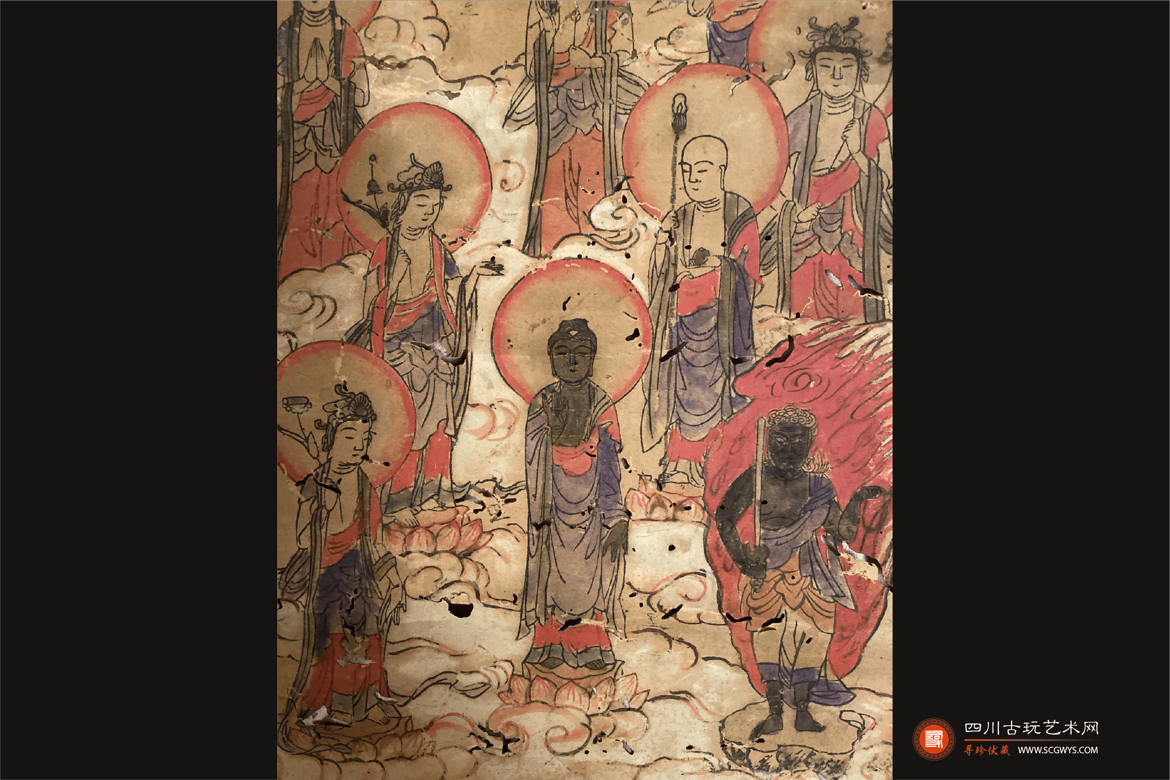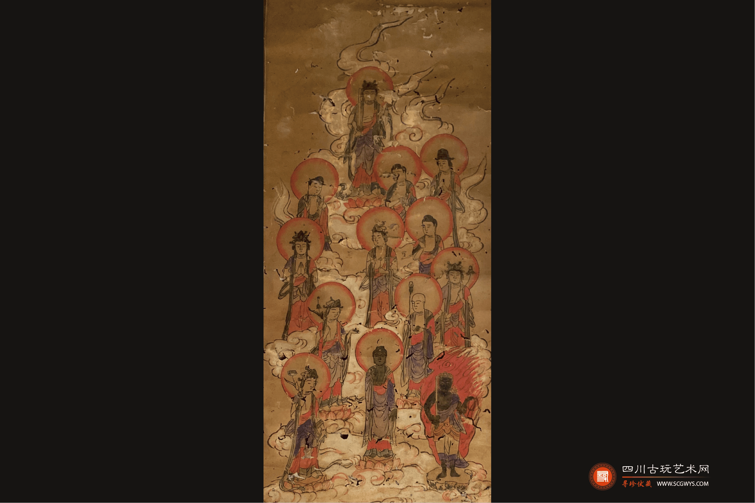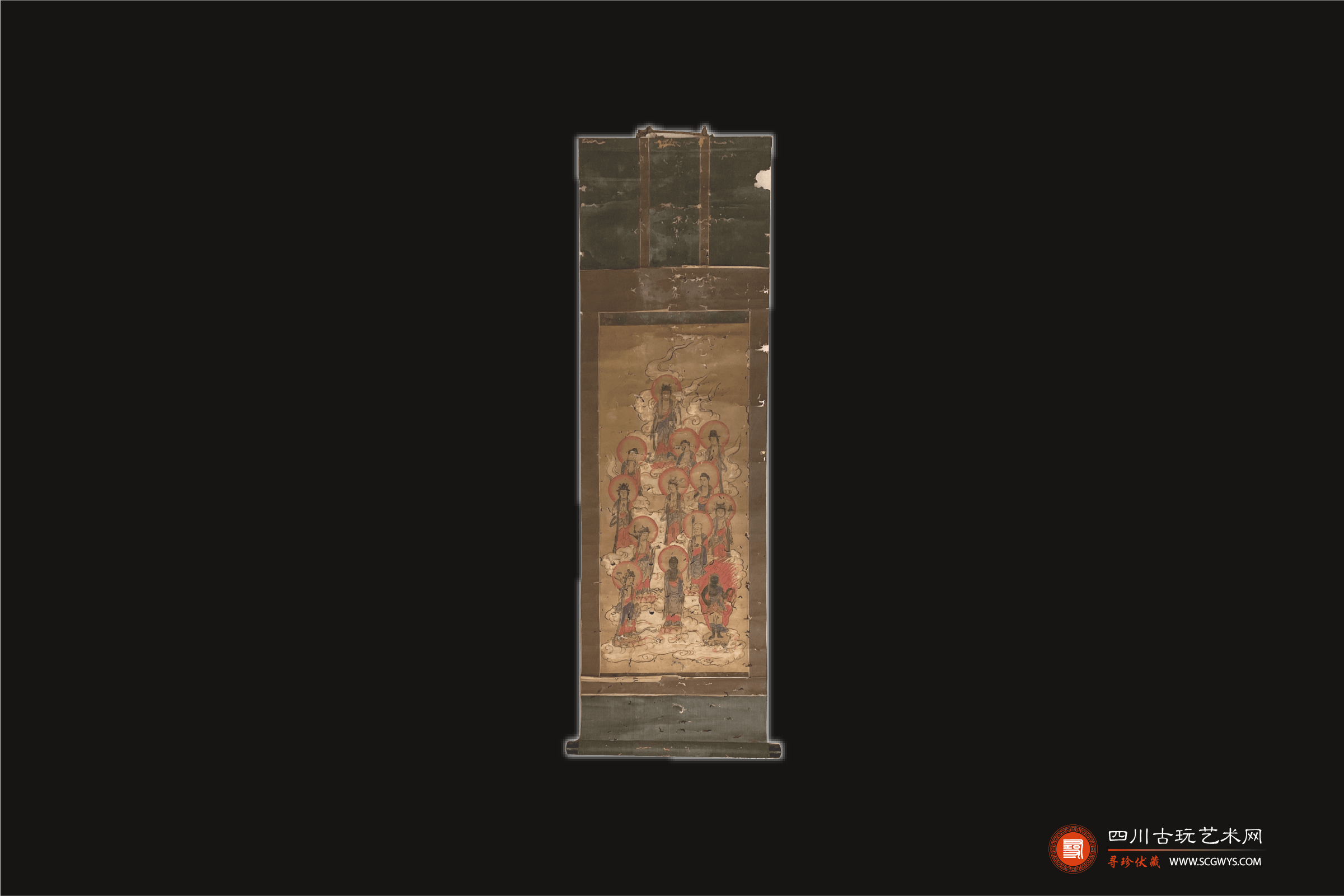 藏品描述:纸本凌裱,木质轴头,画面呈现十三个形态各异的站立佛像,手持法器,头光,祥云,无款,画芯损坏较为严重。