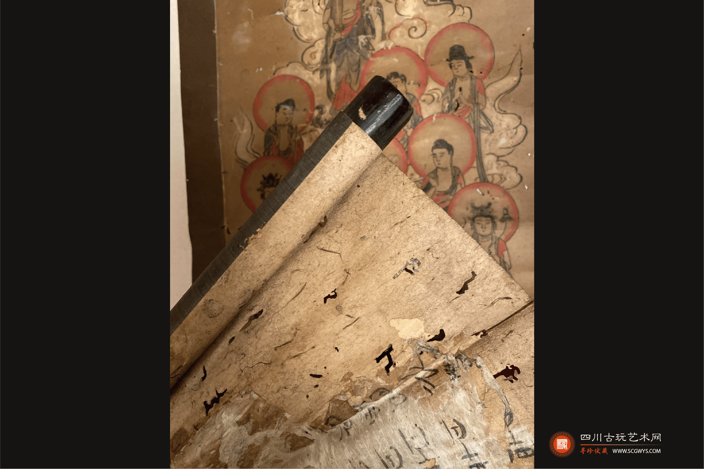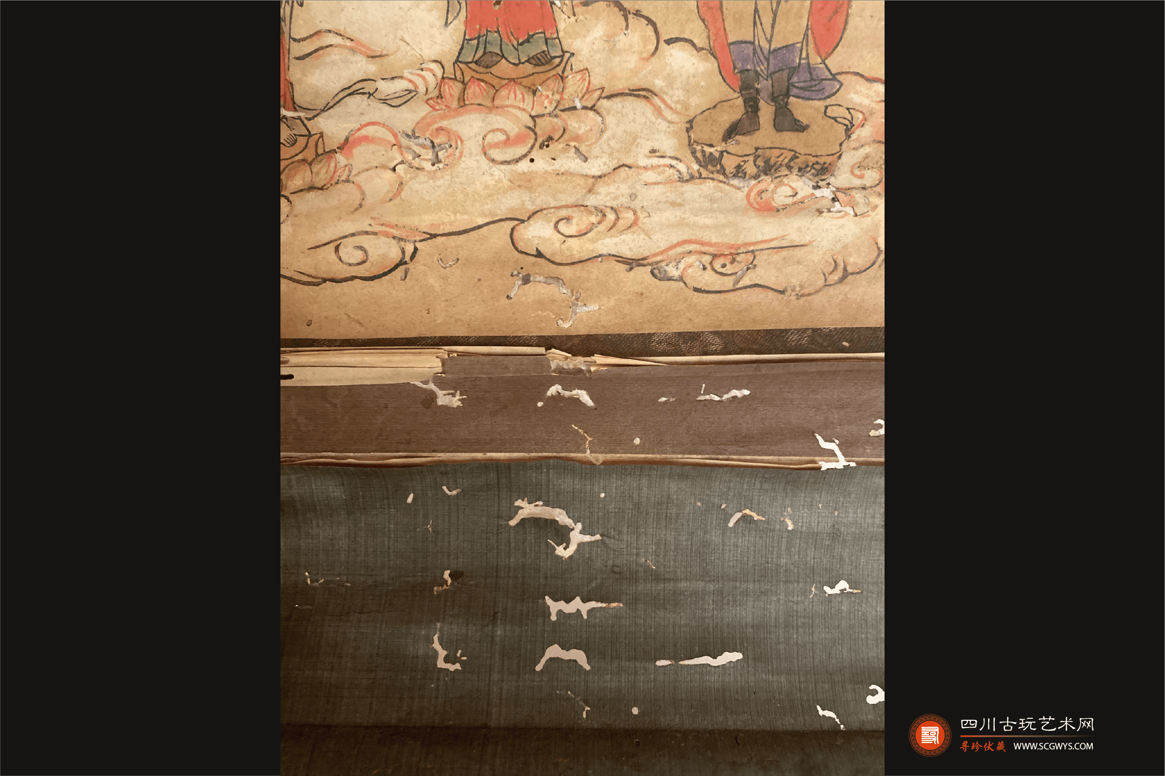藏品鉴定:根据装裱包浆、画芯材质、墨迹、磨损痕迹初步判断非人为做旧。